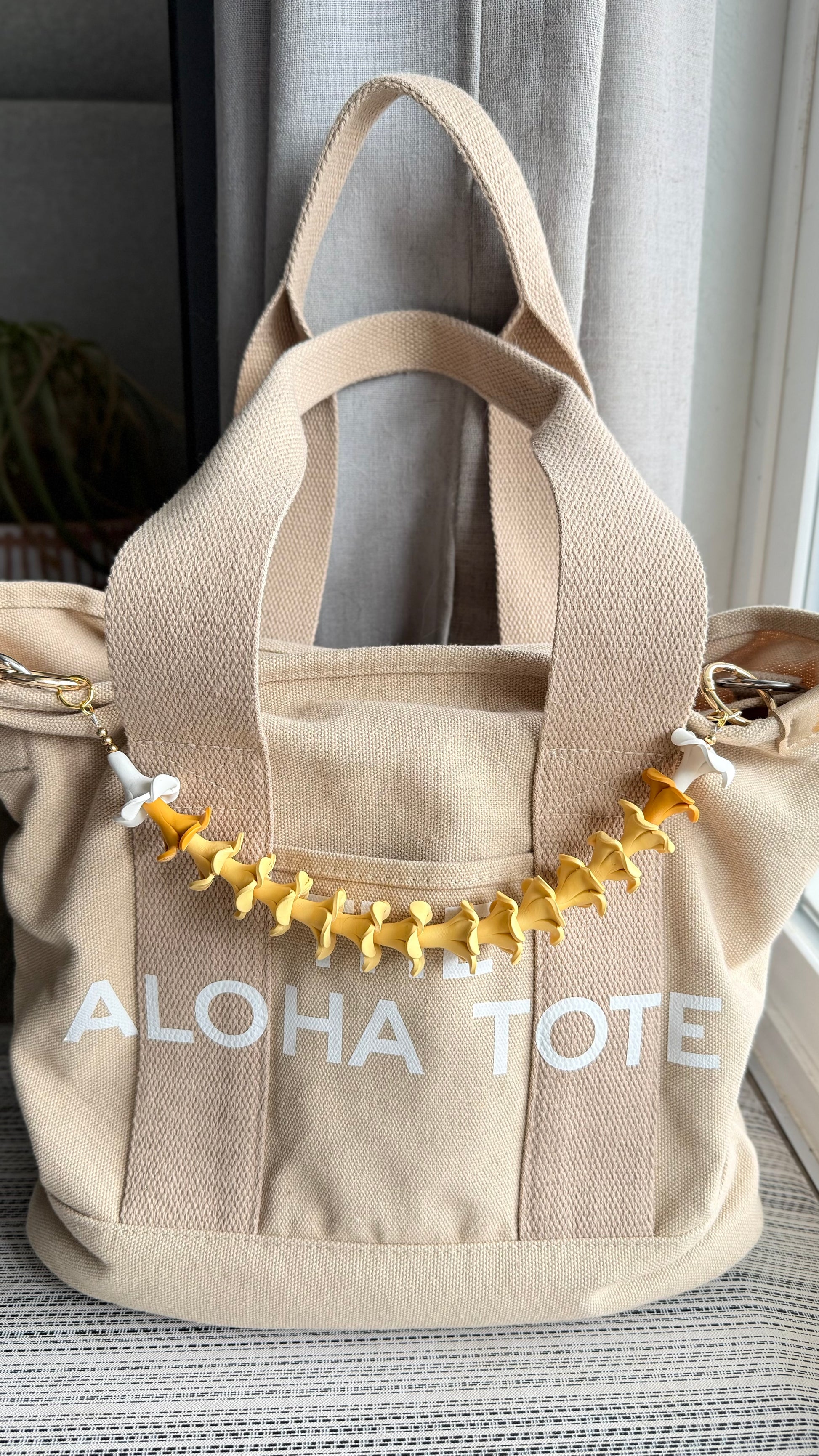 Elevate your everyday style with our Lei Drape. A strand of handcrafted polymer clay flowers designed to drape beautifully across your handbag. Each flower is shaped with care, bringing a touch of aloha and artistry to your daily look.