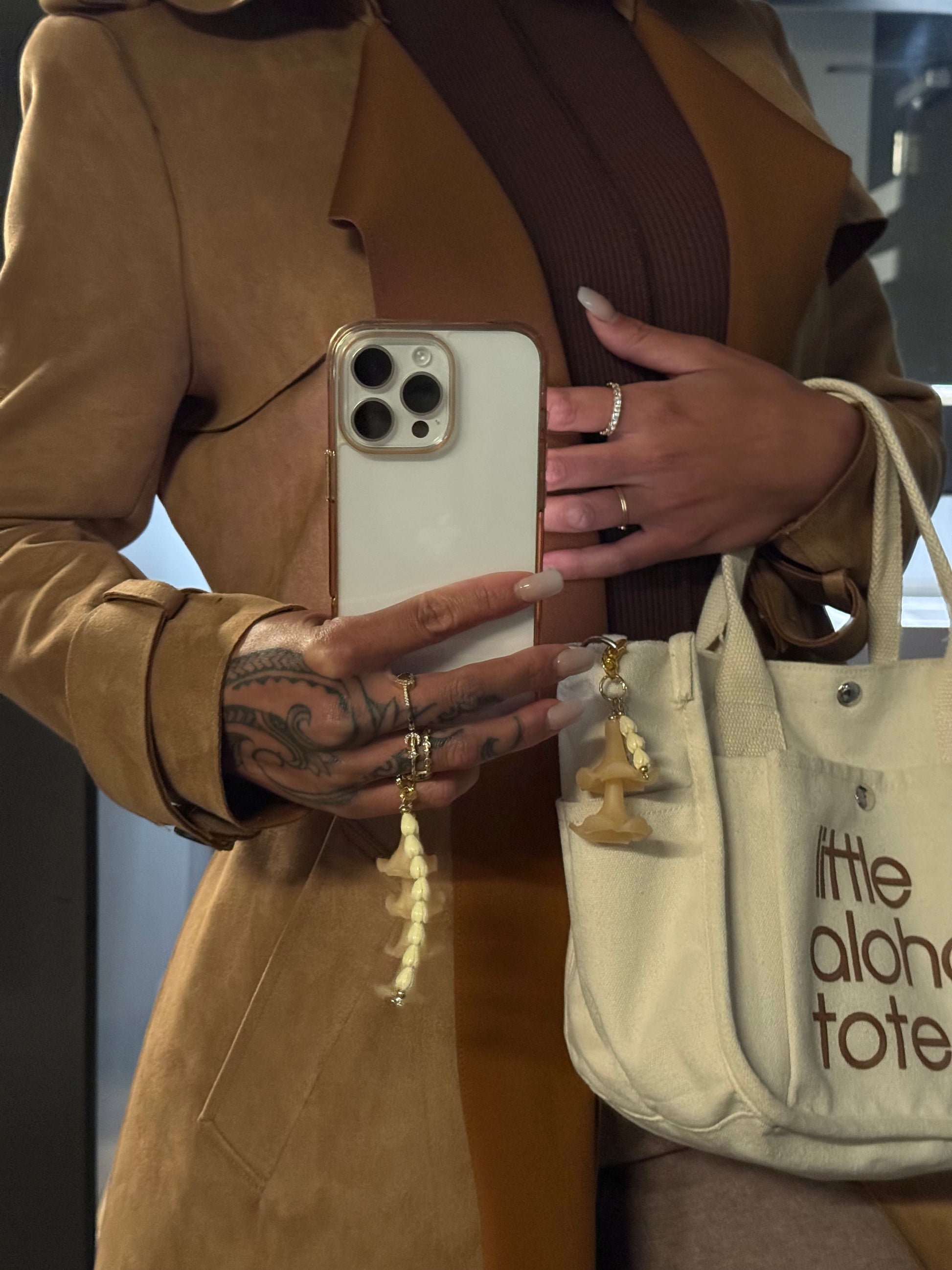 This charm attaches easily to any phone case with a universal tether and makes a sweet statement on your bag, keys, or wristlet as well.